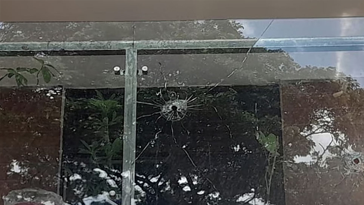 পুলিশ জানায়, বাড়িটির দোতলার বারান্দার কাছে দুটি গুলির চিহ্ন দেখা গেছে।